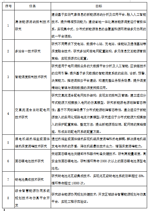 1.电网技术。研究源网荷储一体化、清洁能源消纳及控制、高渗透率交直流混联大电网安全稳定运行等技术。开展交直流混合主动配电网技术研究。推广新能源场站送出等场景的柔性直流技术。研究智能调度控制技术,构建省地县配一体化的智能调度管控体系。研发大容量柔性直流输电及柔性直流配电网核心设备,开发环保、节能型新装备、新材料及高性能传感、超导材料。