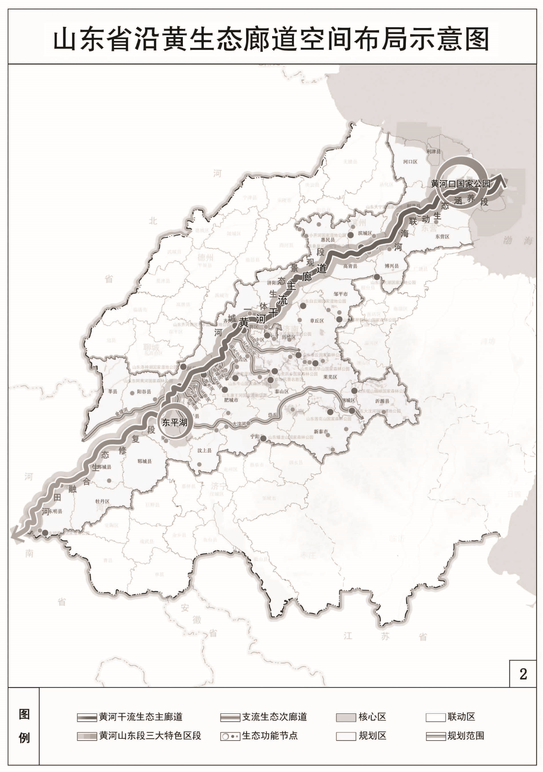“多点”,即多处生态功能节点。依托自然保护区、自然公园、水利风景区等重要生态节点,合理定位自然保护地主体功能、边界范围,高标准建设黄河口国家公园,高水平提升东平湖生态功能,高质量建设济南大寨山、泰安徂徕山等自然保护区,高品质建设泰山风景名胜区等自然公园和菏泽黄河、济南百里黄河、垦利区黄河口等水利风景区,建立系统完善的自然保护地体系。