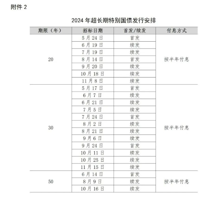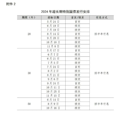 从“日程表”看,自5月中旬持续至11月中旬,20年、30年和50年超长期特别国债将分别发行7期、12期、3期,首发日期分别为5月24日、5月17日、6月14日。