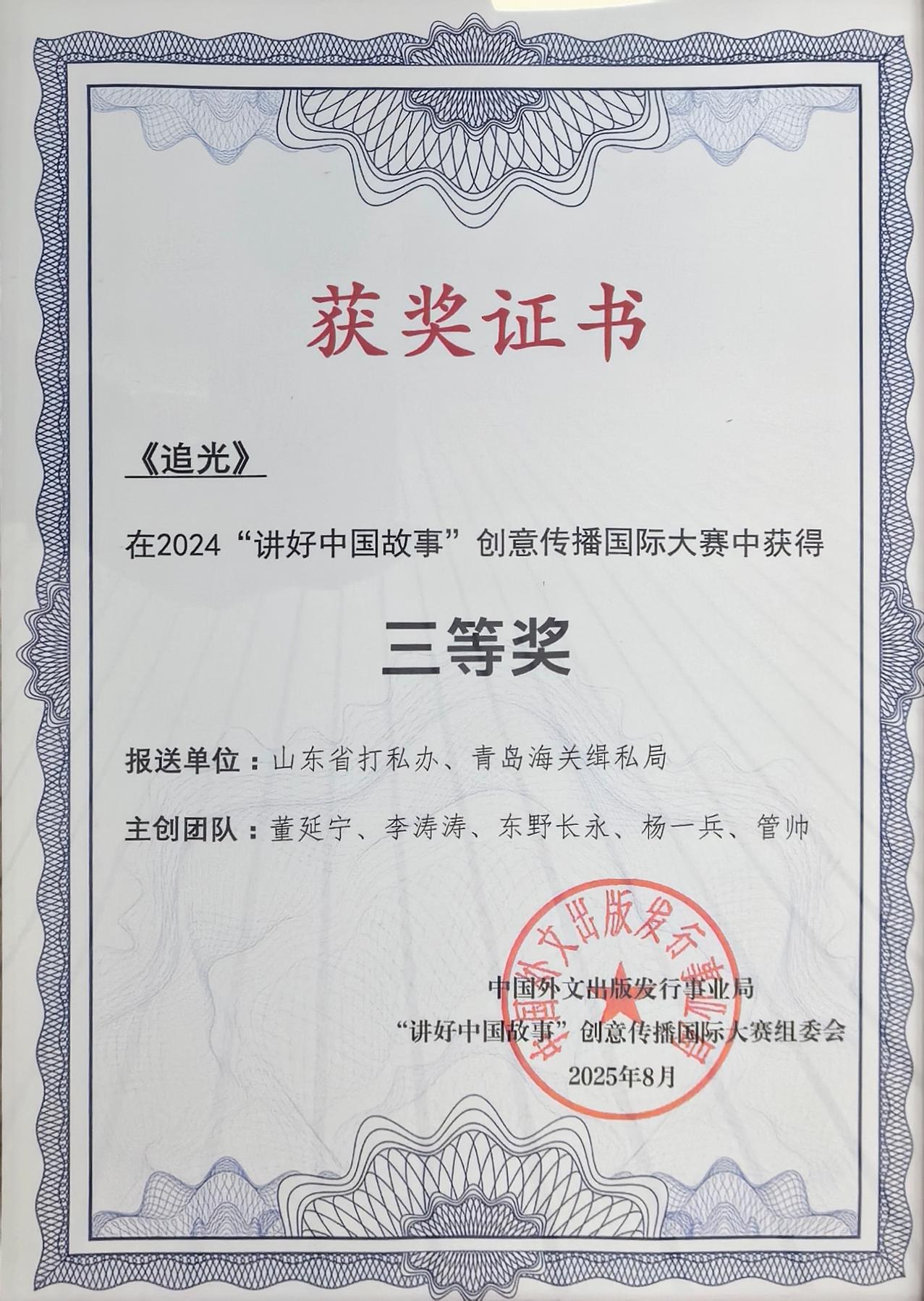 11月19日,2024“讲好中国故事”创意传播国际大赛颁奖典礼在河北雄安新区落下帷幕。由山东省打私办会同青岛海关缉私局、青岛市反走私综合治理新时代“枫桥经验”工作站联合制作的反走私主题微电影《追光》,从全球1.5万余件参赛作品中脱颖而出,荣获大赛三等奖,成为山东反走私工作对外传播的一张亮眼名片。