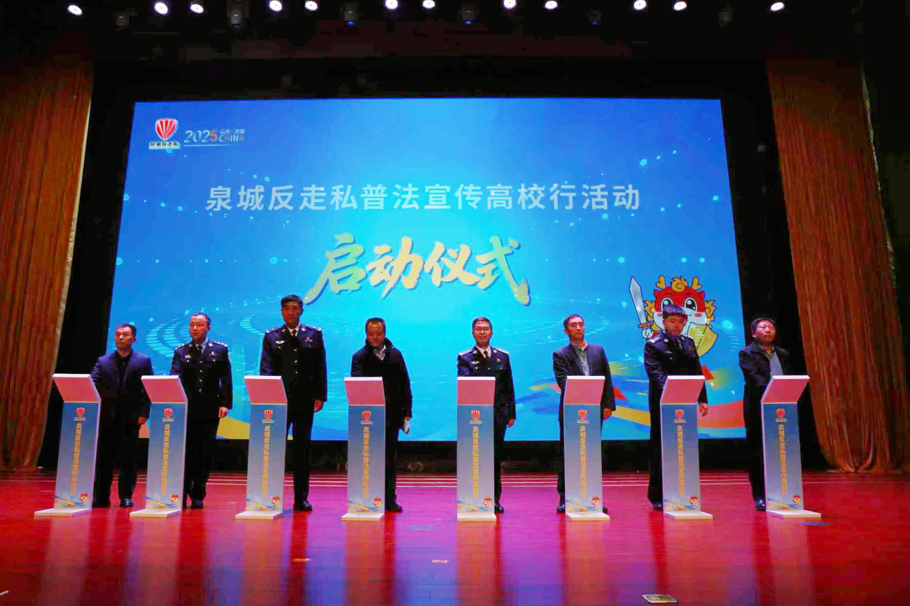 启动环节,山东警察学院学生表演了丰富多彩的文艺节目,演唱自创歌曲《青春反走私》、朗诵诗歌《致敬反走私国门卫士》等;山东警察学院、济南市口岸和物流办公室打击走私综合治理处负责同志分别致辞,全国打私办二级巡视员关向应讲话;山东警察学院反走私宣传协会负责人分享了参加全国大学生反走私创作大赛的感悟;与会嘉宾代表共同按动启动装置,“泉城反走私普法宣传高校行”活动正式拉开帷幕。