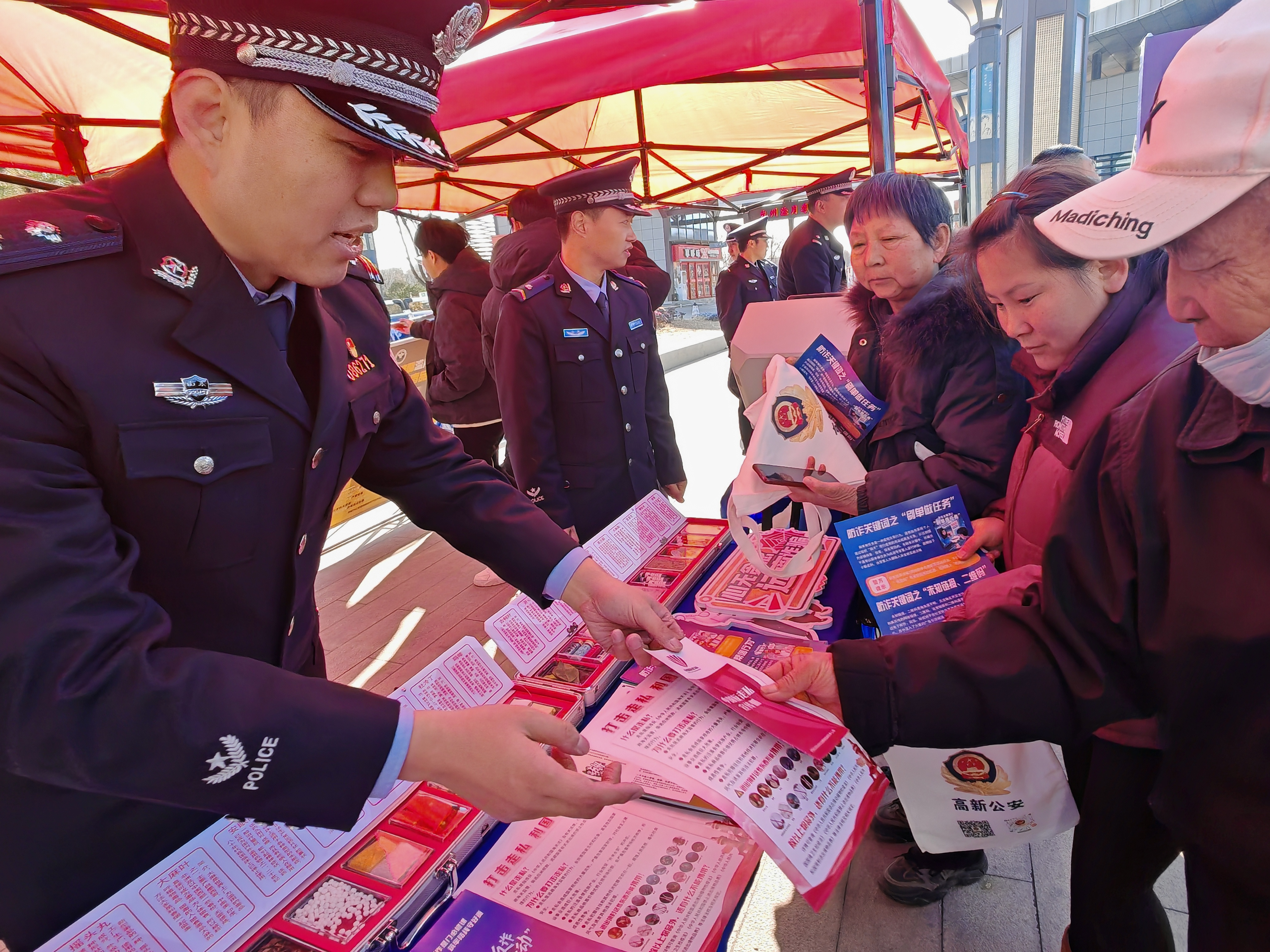 高新区在活动现场设置了法律宣讲区、案例解析区、互动问答区和咨询服务台四大功能区域,工作人员与民警化身“普法宣传员”,围绕群众关心的热点问题展开宣传。民警结合辖区实际案例,深入浅出剖析走私冻品、成品油、奢侈品等常见走私行为的危害,不仅揭示其对国家经济秩序的破坏,更点明走私物品可能给群众健康安全带来的潜在风险。现场通过发放反走私宣传手册、文创产品等让群众在答题过程中加深了对法律知识的理解和记忆。